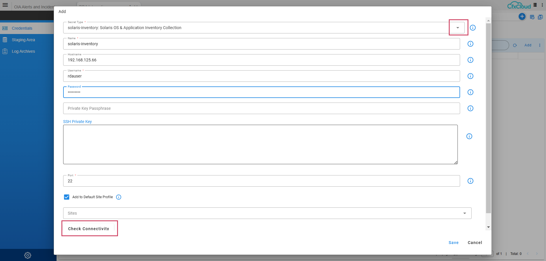 Select Solaris Inventory in the secret type drop down menu -> solaris-inventory: Solaris OS & Application Inventory Collection