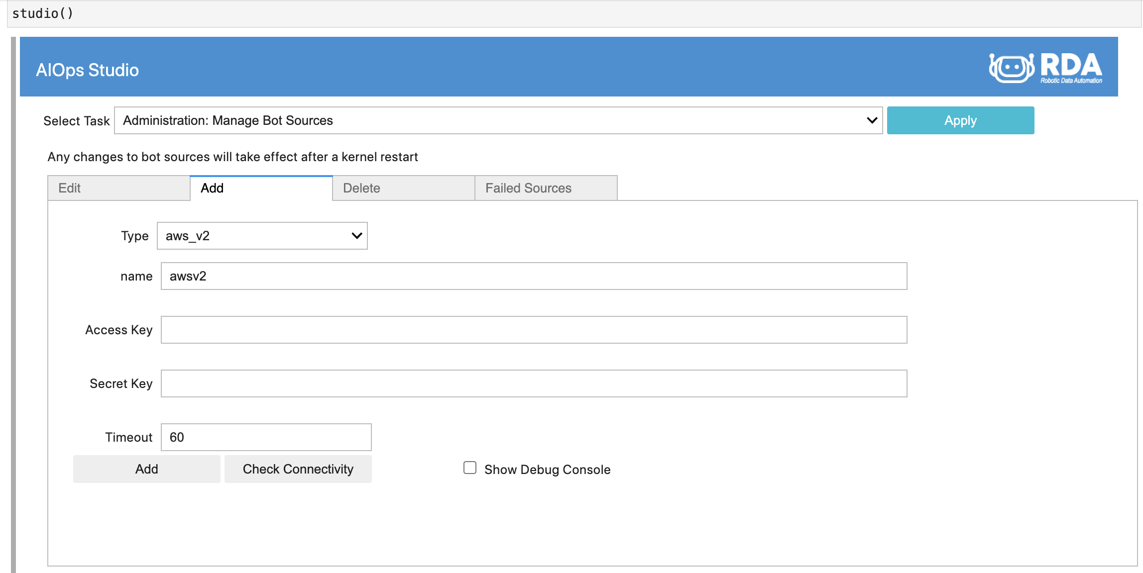 - In RDA Studio, Select Task 'Administration: Manage Bot Sources'
