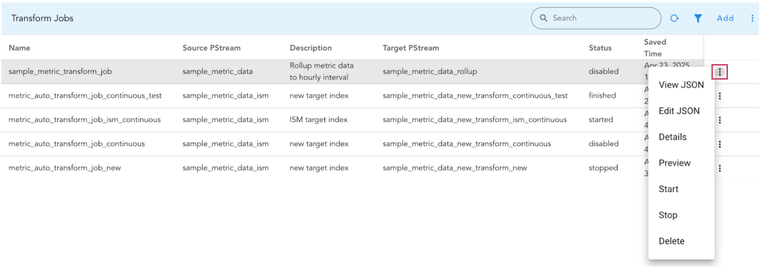To Manage Transform Jobs from UI, Go to Configuration -> RDA Administration -> Persistent Streams -> Transform Jobs