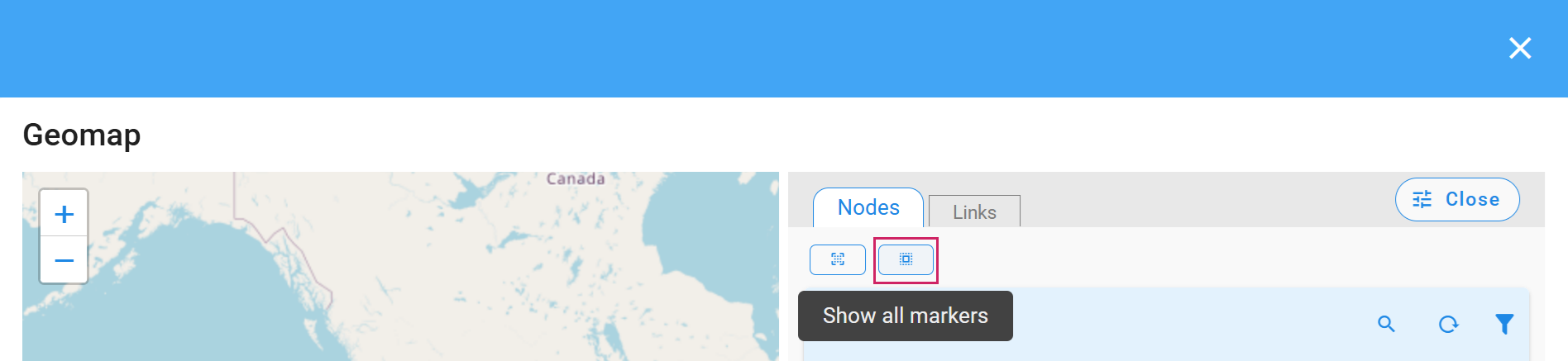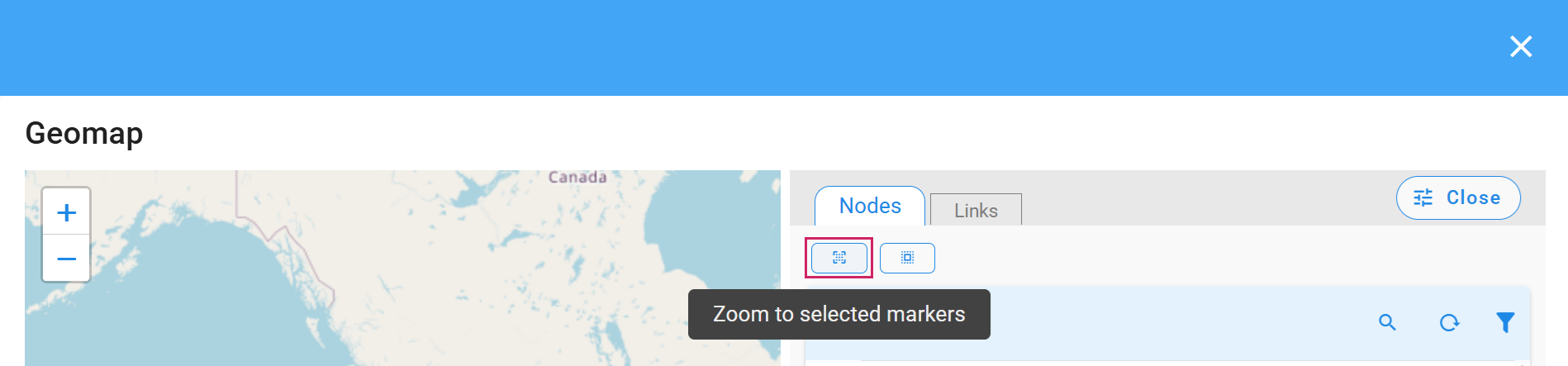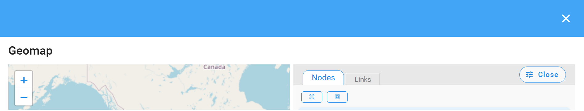 Elements : The Nodes/Links tables display the node and link elements shown in the Geomap view and provide detailed information about each of these elements. The Geomap view is always synchronized with the current selection in the control panel, ensuring that the geomap view updates to highlight only the relevant elements based on the selection.