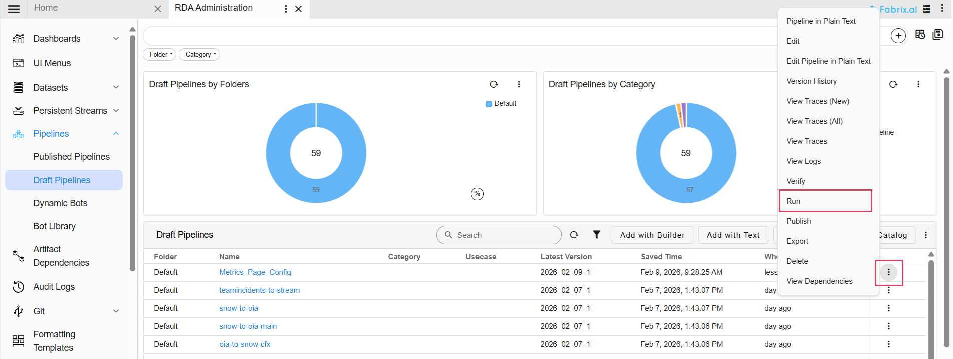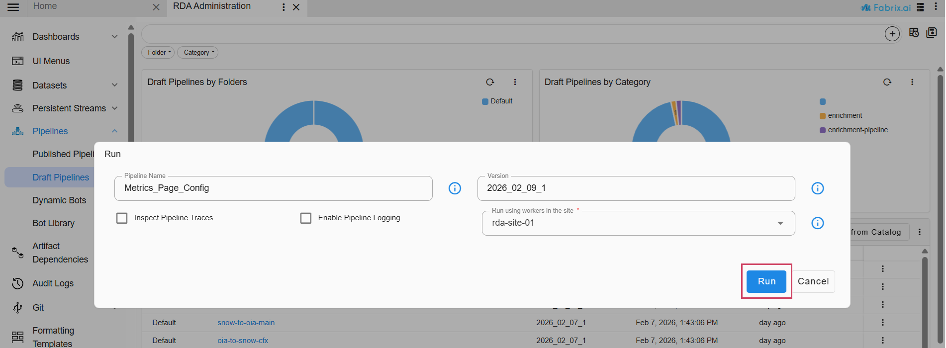 • Navigation Path : Go to Home → Navigate to the Configuration -> RDA Administration -> Pipelines -> Draft Pipelines -> Add with Text Give the Pipeline Name -> Version -> copy the below given Pipeline and Save -> Click on Run as shown in the screenshot below.